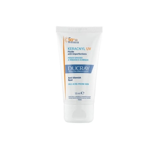 Le Fluide Anti-Imperfections SPF50+ KERACNYL UV de Ducray est un soin solaire destiné aux peaux grasses à tendance acnéique. Sa formule assure une haute protection contre les UV tout en favorisant la disparition des imperfections et en limitant leur réapparition. Cette crème solaire convient aux adultes et aux adolescents à partir de 12 ans. Sa texture fluide s’applique facilement sans laisser de fini gras ou collant sur la peau. Le visage est alors plus confortable, hydraté et protégé du soleil. Conseils d’utilisation : Avant toute exposition solaire, appliquer un doigt de produit sur le visage Renouvelez fréquemment pour maintenir la protection, surtout après vous être baigné ou essuyé et avoir transpiré Précaution d’emploi : Ne restez pas trop longtemps au soleil, même si vous utilisez un produit solaire. L’abus de soleil est dangereux. Attention : réduire la quantité conseillée diminue de façon significative la protection apportée. Composition : WATER (AQUA). C12-15 ALKYL BENZOATE. DICAPRYLYL CARBONATE. METHYLENE BIS-BENZOTRIAZOLYL TETRAMETHYLBUTYLPHENOL [NANO]. DIISOPROPYL ADIPATE. SILICA. BIS-ETHYLHEXYLOXYPHENOL METHOXYPHENYL TRIAZINE. DIETHYLHEXYL BUTAMIDO TRIAZONE. ZEA MAYS (CORN) STARCH (ZEA MAYS STARCH). BUTYL METHOXYDIBENZOYLMETHANE. C10-18 TRIGLYCERIDES. DECYL GLUCOSIDE. GLYCERIN. GLYCERYL STEARATE. PEG-100 STEARATE. POTASSIUM CETYL PHOSPHATE. ACRYLATES/C10-30 ALKYL ACRYLATE CROSSPOLYMER. BENZOIC ACID. CAPRYLYL GLYCOL. DISODIUM EDTA. FRAGRANCE (PARFUM). GLYCERYL BEHENATE. GLYCERYL DIBEHENATE. GLYCERYL LAURATE. MYRTUS COMMUNIS LEAF EXTRACT. NIACINAMIDE. PENTYLENE GLYCOL. PROPYLENE GLYCOL. SODIUM HYDROXIDE. STEARYL ALCOHOL. TOCOPHEROL. TRIBEHENIN. TRIPTERYGIUM WILFORDII CALLUS EXTRACT. XANTHAN GUM