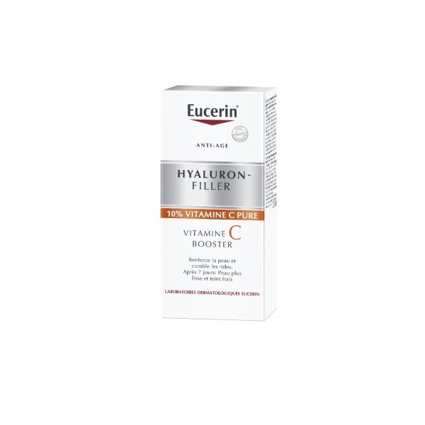 - DescriptionEucerin Hyaluron-Filler Vitamine C Booster 8 ml est un soin qui renforce la peau et comble les rides. Après 7 jours, la peau est plus lisse et le teint est frais.L’innovation relève de sa composition :- 10% de Vitamine C pure, antioxydant efficace qui stimule la production de collagène dans les cellules de la peau,- acide hyaluronique de bas poids moléculaire qui pénètre dans les couches épidermiques de la peau où se forment les rides,- licochalcone A, autre antioxydant puissant qui améliore également la défense antioxydante cellulaire de la peau.Il contient de l’Acide Ascorbique qui peut augmenter la sensibilité de la peau au soleil et particulièrement la possibilité d’un coup de soleil. Il convient donc d’utiliser un écran solaire durant l’application et une semaine après la dernière utilisation.Ce flacon permet une cure de 7 jours.