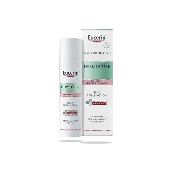 Sérum triple action Dermopure, un soin concentré formulé pour combattre les marques post-acné, les imperfections et pour diminuer la brillance.