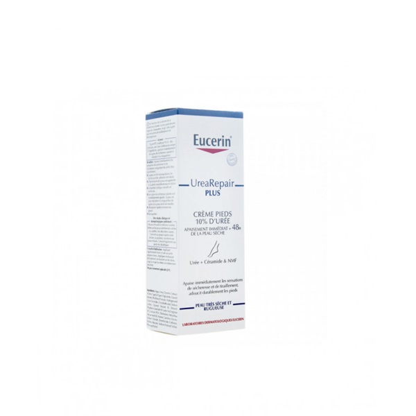 - La crème pour les pieds Urea Repair Plus des laboratoires Eucerin est conçue pour hydrater, réparer et apaiser les pieds secs présentant des rugosités. Elle peut également convenir aux pieds abîmés des personnes diabétiques. Cette crème est appréciée pour lutter contre la sécheresse des pieds à un stade léger ou avancé. Elle peut être appliquée quotidiennement pour prendre soin des pieds crevassés ou fissurés. Elle permet de soulager rapidement les sensations d’inconfort associés à la sécheresse cutanée, notamment les tiraillements, et de réduire l’aspect rugueux de la peau sèche.Les pieds représentent l’une des zones les plus fréquemment exposées au dessèchement cutané. La peau sèche n’est pas capable de réguler correctement son hydratation, c’est pourquoi elle a parfois besoin d’un petit coup de pouce. Cette crème réparatrice pour les pieds est composée d’ingrédients qui vont venir nourrir et régénérer l’épiderme. On retrouve notamment dans la composition de la glycérine et de l’urée, deux agents qui vont hydrater la peau en profondeur. L’urée est particulièrement recommandée pour assurer à vos pieds douceur et souplesse. Cette crème contient également des céramides, qui sont des actifs reconnus pour leurs propriétés relipidantes et protectrices. Appliquée régulièrement, la crème pieds Eucerin Urea Repair Plus contribue à lutter contre les talons fendillés, les callosités et les durillons.Contenance : 1 tube de 100 ml