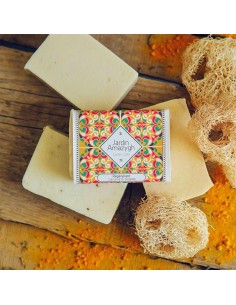 Ce savon au curcuma et à l’huile de sésame est régénérant. Le savon Jardin Amazygh est saponifié à froid. Il lave sans dessécher la peau. Surgraissé à 8 %, il protège et nourrit les peaux les plus sensibles. Sans conservateur. Biodégradable