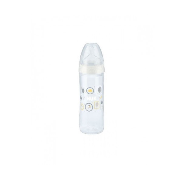 Biberon NUK New Classic de 250 ml, corps étroit avec tétine en silicone Nuk First Choice Plus de 6 à 18 mois M (lait) NUK New Classic – c’est la première génération de biberons de NUK avec une forme de bouteille fine classique et une large ouverture de bouteille.