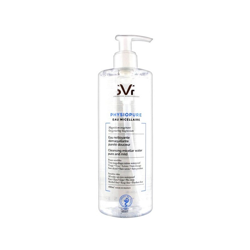 SVR Physiopure Eau Micellaire Eau Nettoyante Démaquillante Pureté Douceur 400 ml est une eau micellaire pour le visage, les yeux et les lèvres, qui est spécialement formulée pour le démaquillage des peaux sensibles.